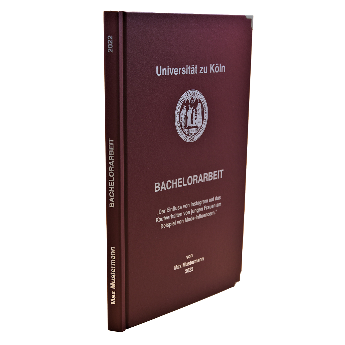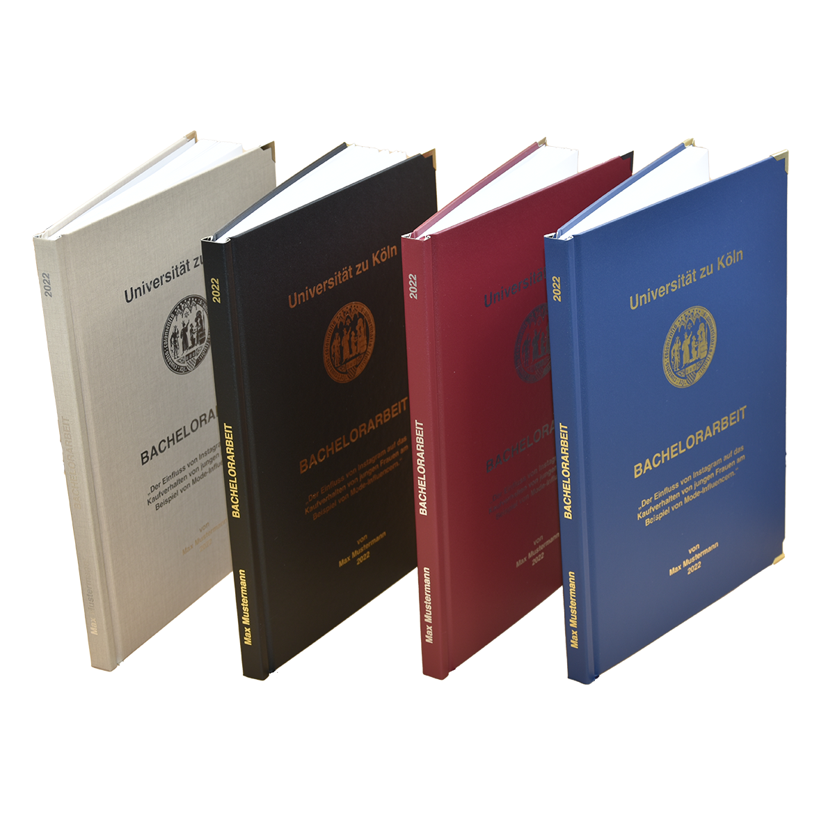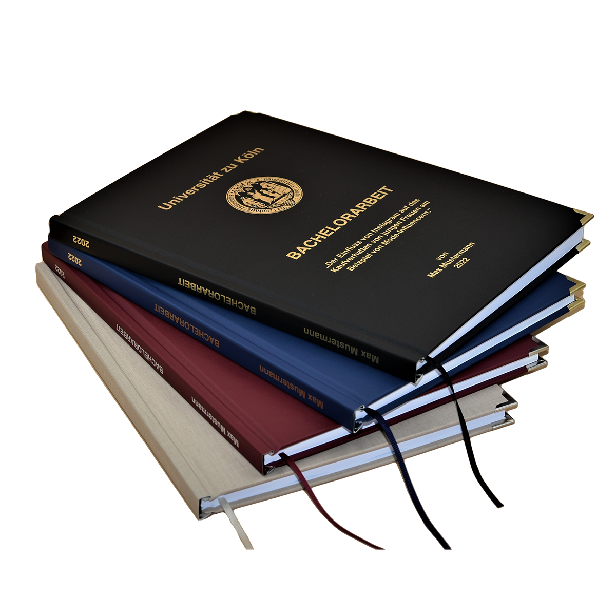 Deine Bachelorarbeit ist fertig geschrieben und Korrekturgelesen, jetzt ist es an der Zeit deine Bachelorarbeit drucken und binden zu lassen. Du hast die Möglichkeit aus deiner Bachelorarbeit eine edle Bindung als Hardcover-Buch zu erstellen. Du hast verschiedene Farben zur Auswahl egal ob bei der Folien-Prägung für das Cover oder bei den Buchecken und dem Leseband, wir lassen keine Wünsche offen. Als Spezialisten für das drucken und binden von Bachelorarbeiten sind wir bereit dir den restlichen Teil abzunehmen. Du musst nur durch den einfachen Online-Konfigurator deine Bestellung abgeben, alles andere übernehmen wir für dich, da du hier einen richtig guten Eindruck bei den Prüfern hinterlassen kannst. Durch eine edle Prägung in gold, silber, bronze und kupfer auf das Cover hast du genügend freie Auswahl. Im Bestellprozess kannst du das Logo deiner Universität auswählen, alternative kannst du die Druckvorlage selbst erstellen und hochladen, hierzu kannst du auch Druckvorlagen von unserer Seite downloaden, die du dann frei bearbeiten kannst. Zusätzlich hast du die Möglichkeit dein Hardcover mit Buchecken und einer Leseband in verschiedenen Farben zu versehen. Nach deiner Bestellung, brauchst du dir keine Sorgen mehr zu machen, ab hier übernimmt unser Team alles weitere. Unser Team ist spezialisiert für das drucken und binden von Abschlussarbeiten. Es werden zwischen allen Schritten Qualitätskontrollen durchgeführt, so dass alles sorgfältig abläuft. Bei Fragen bzw. Hilfestellung, kannst unser Team jeder Zeit telefonisch oder per Email kontaktieren.